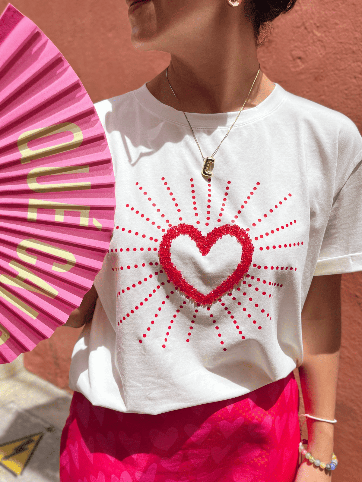 Esta franela de tela fría colombiana combina comodidad y estilo con un diseño único. Presenta un corazón estrellado en cristales rojos adheridos en relieve, que añade un toque brillante y distintivo. Además, cuenta con mangas dobladas para un acabado casual y moderno, ideal para lucir fresca y a la moda en cualquier ocasión.