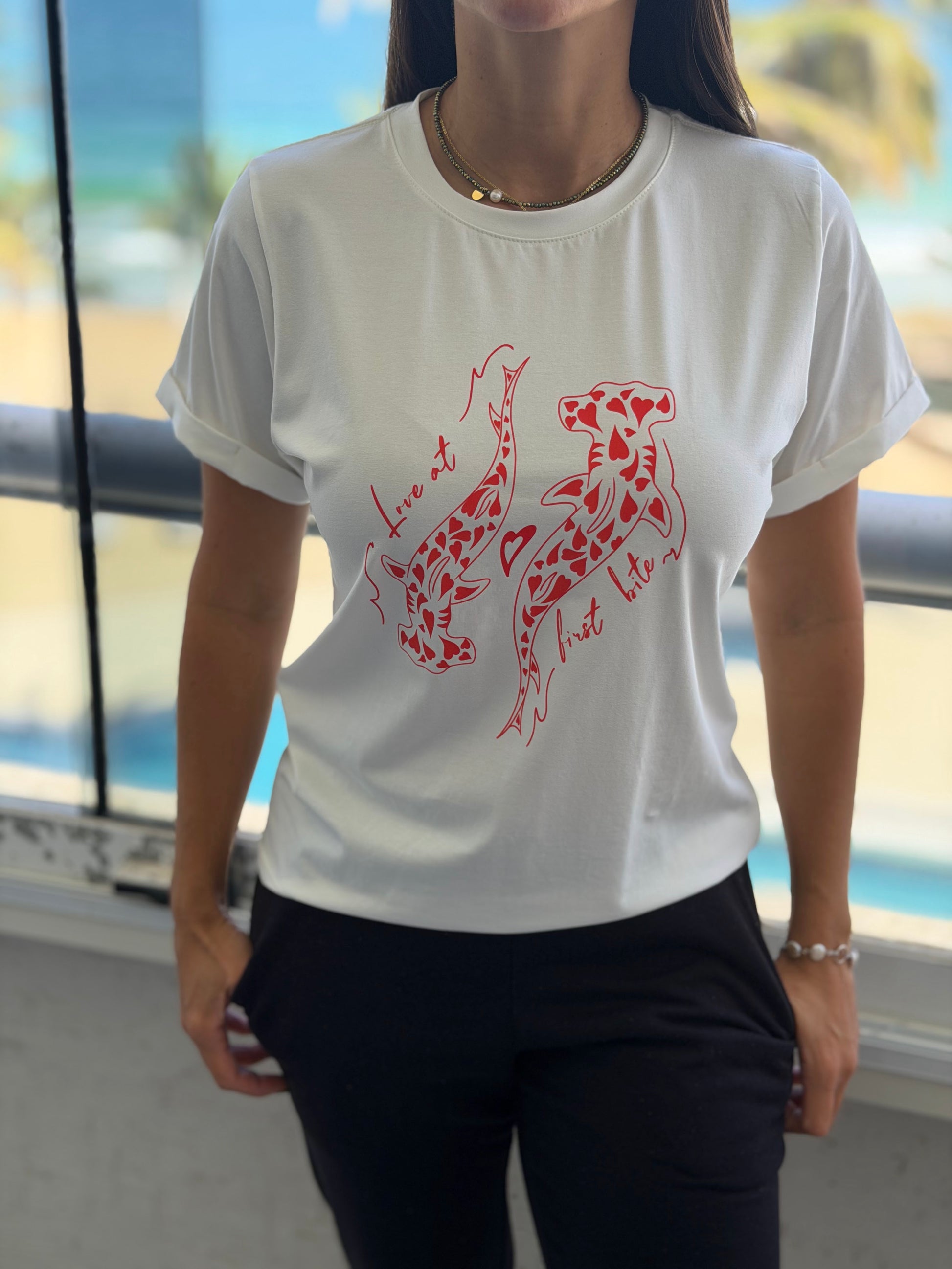Franela Love It en blanco marfil con un vibrante estampado anaranjado que presenta dos tiburones martillo. Perfecta para un look casual y cómodo, esta prenda combina un diseño único y llamativo con la suavidad característica de la franela. Ideal para quienes buscan expresar su estilo personal con una pieza versátil que destaca. Material de calidad que garantiza durabilidad y confort en tu día a día.