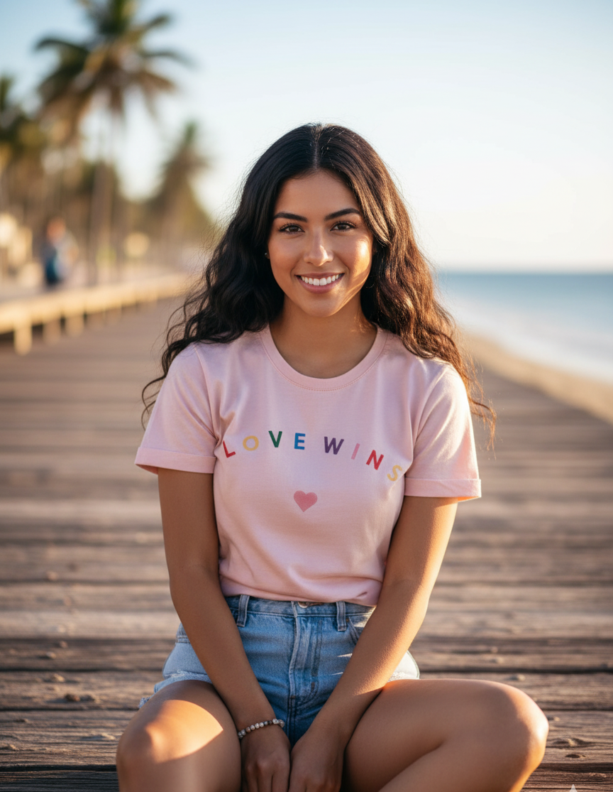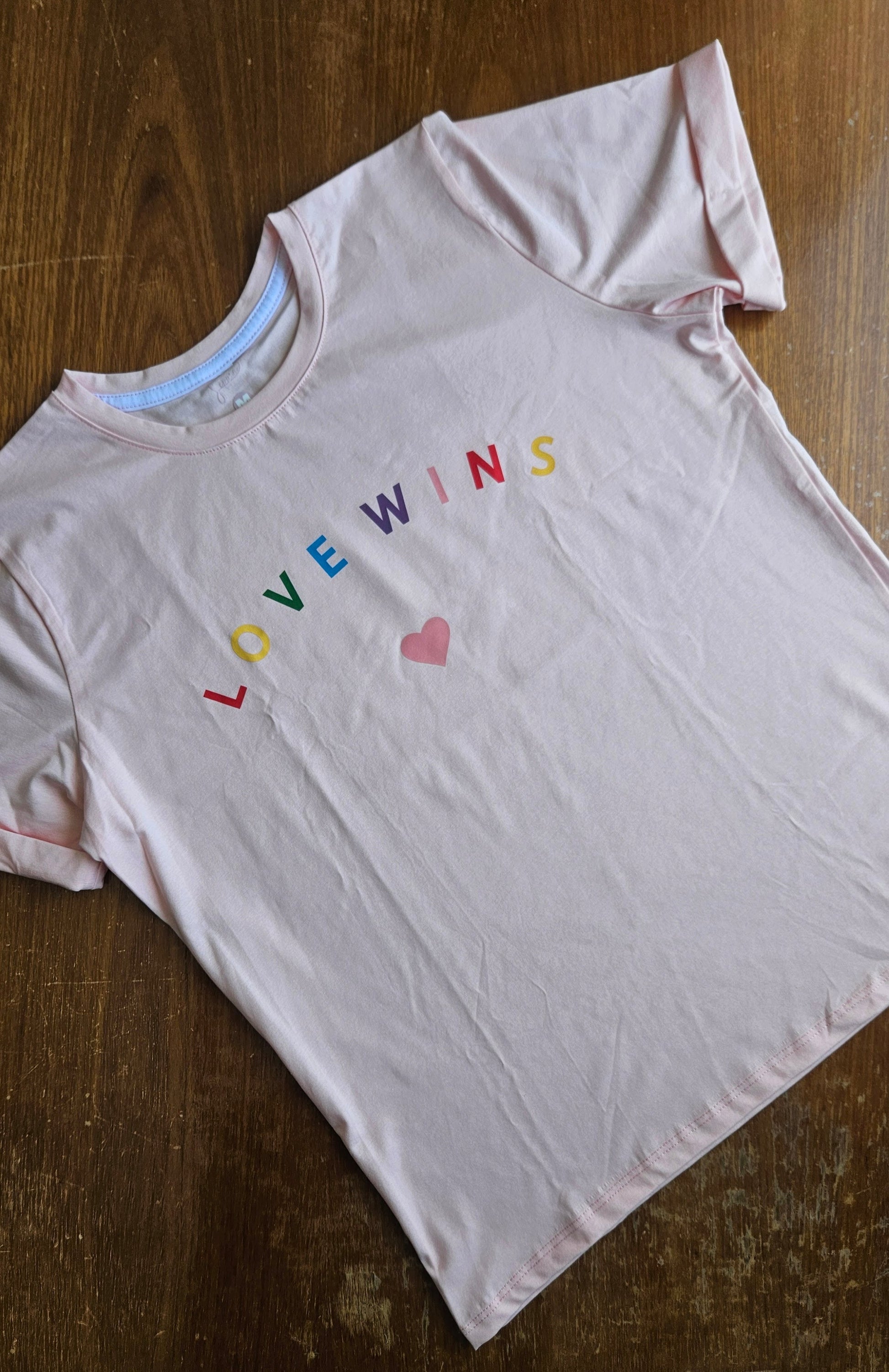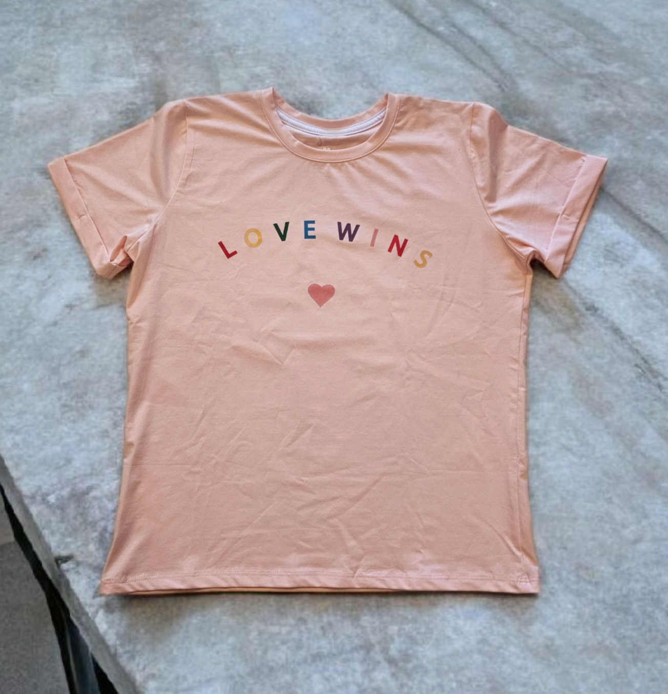 Esta franela de tela fría en un suave tono rosa bebé ofrece comodidad y frescura durante todo el día. Su diseño incluye la frase "Love Wins", celebrando el mensaje de amor y aceptación. Ideal para quienes buscan un estilo casual y significativo.