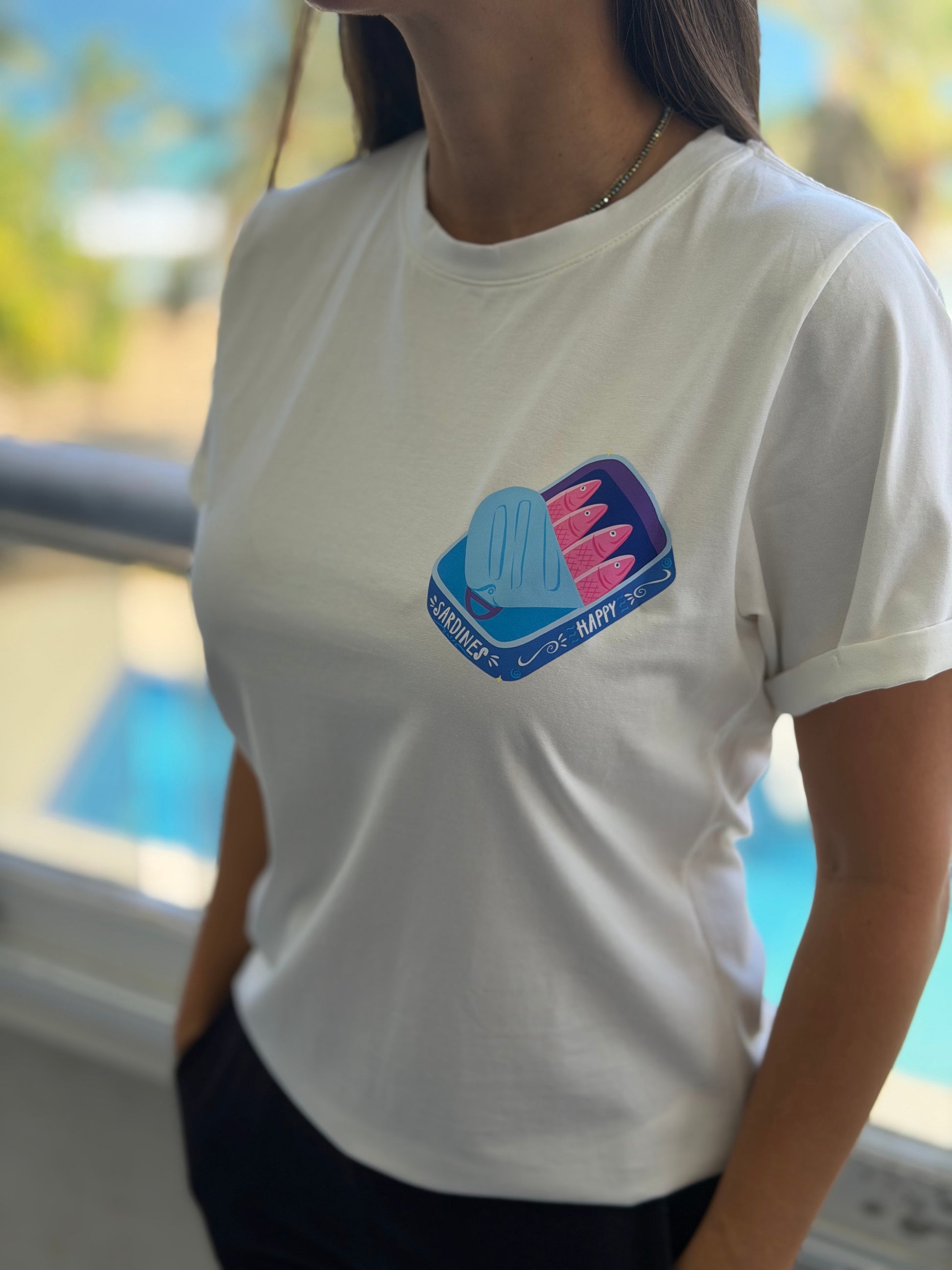 Franela Blanca Marfil con Diseño de Sardinas Enlatadas Cómoda franela en tono blanco marfil que destaca por su original estampado de sardinas enlatadas en vibrantes colores azul y rosado. Perfecta para un look casual y desenfadado, esta prenda combina comodidad con un diseño único y llamativo. Ideal para quienes buscan expresar su personalidad a través de prendas con carácter. Material suave y transpirable, versátil para cualquier ocasión del día.