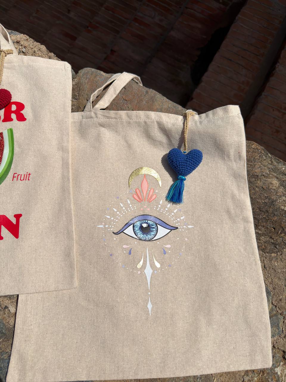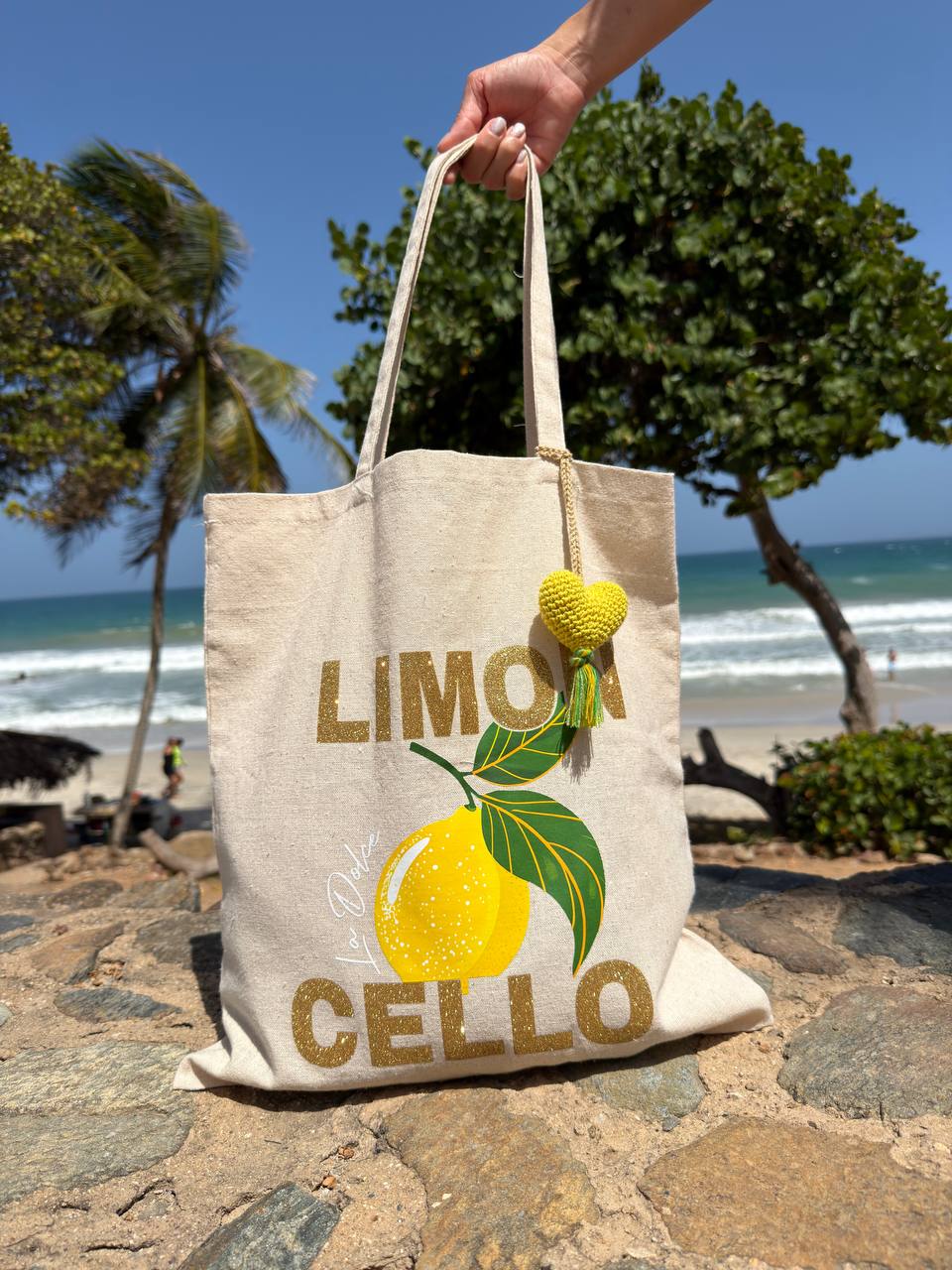 Hermoso Tote bag perfecto para dia de playa o un lindo paseo, acompanado de un corazon en los mismos tonos hecho a mano en crochet