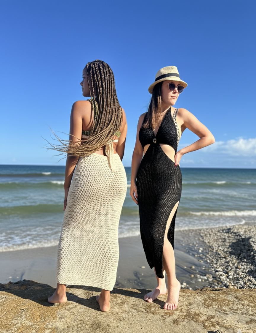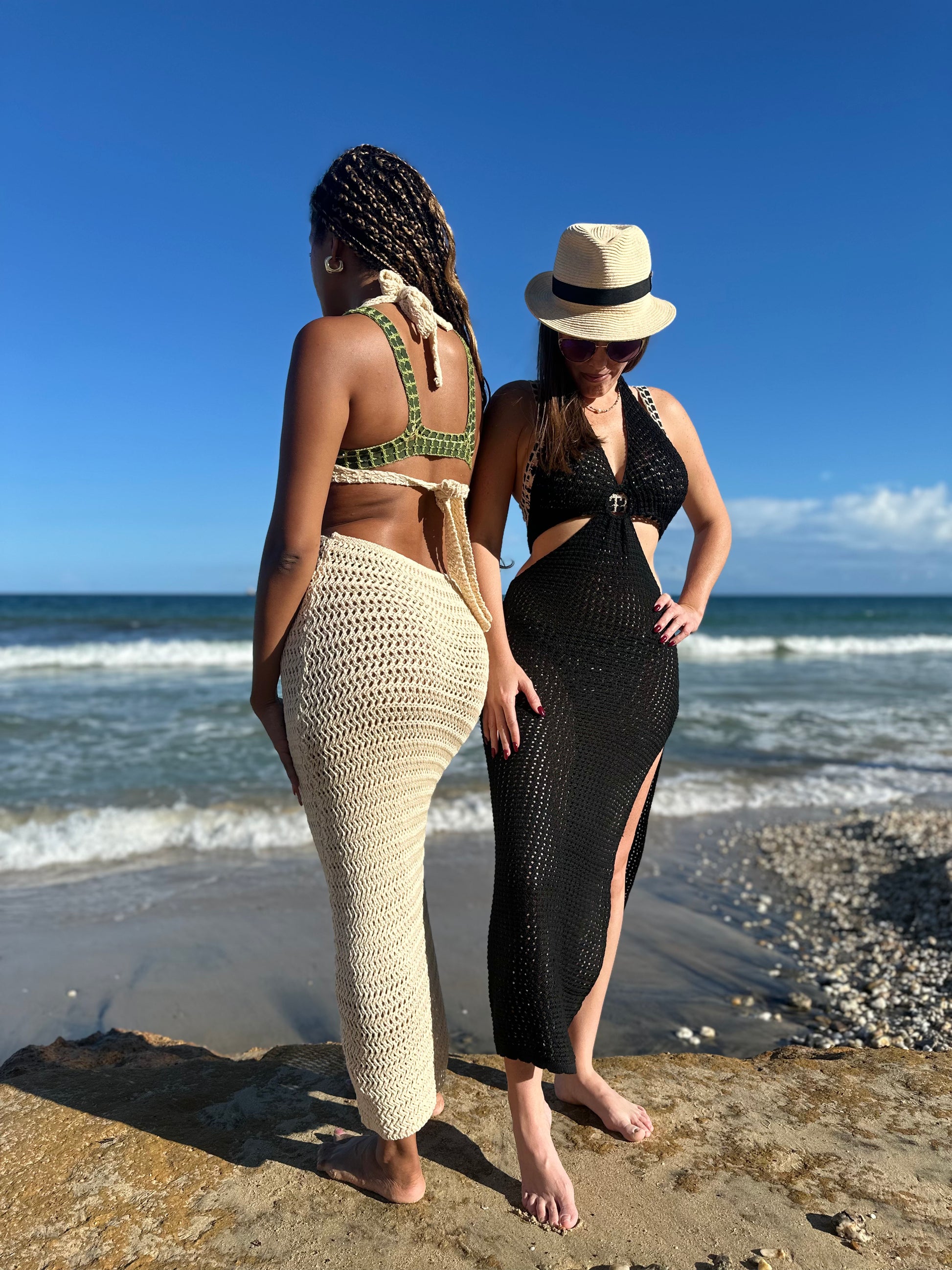 Este vestido largo y ajustado con aberturas "cut-out" y tajo lateral es elegante y moderno. El herraje decorativo en el escote eleva aún más el diseño. Confeccionado en tejido de punto elástico, se amolda perfectamente al cuerpo para resaltar tus curvas. ¡Lucirás espectacular en cualquier ocasión!