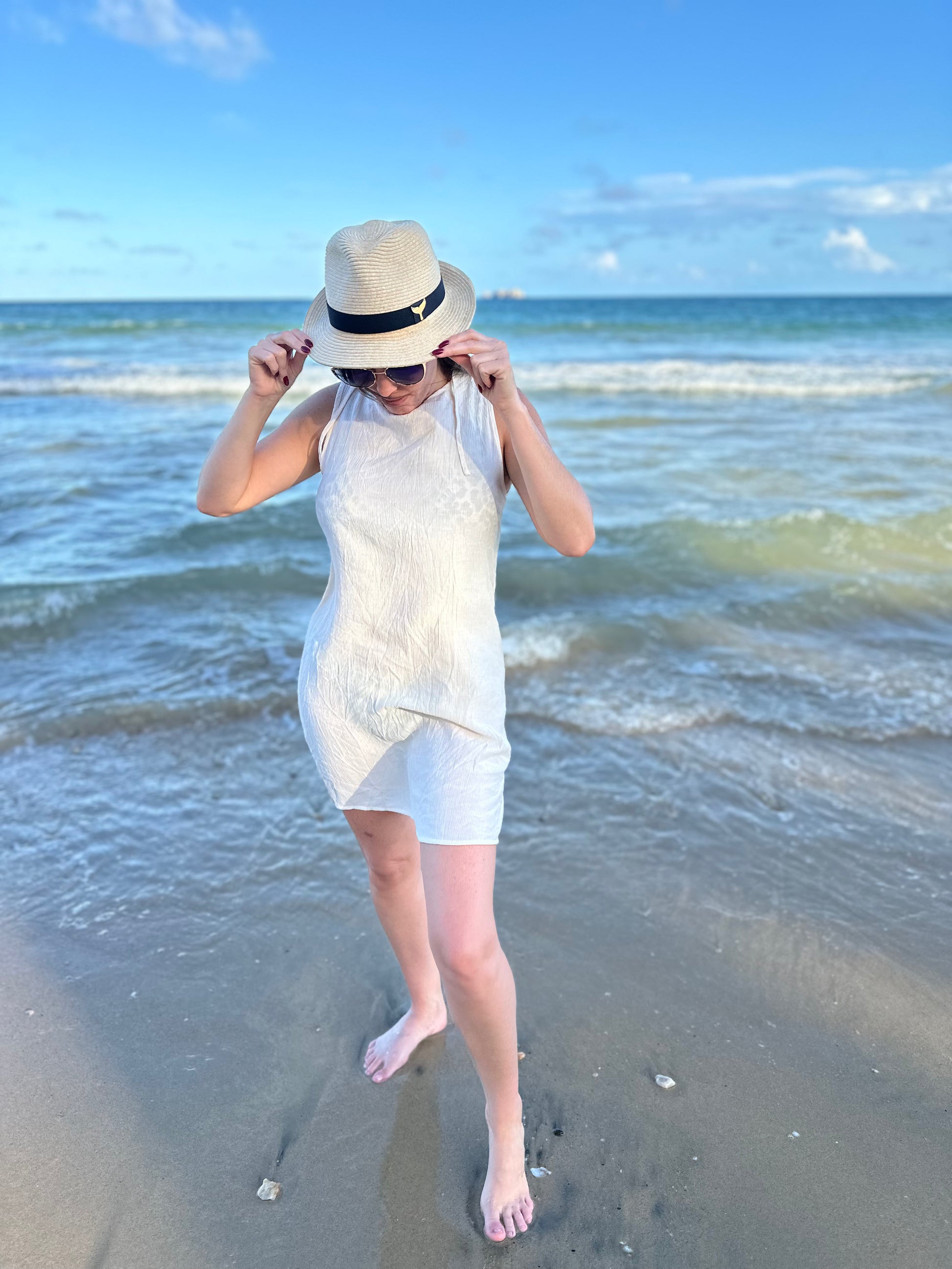 Vestido de silueta recta y sin mangas con cuello redondo en la parte delantera y escote en V en la espalda. Decorado con un elegante borde de encaje, este vestido playero en tono crema te hará lucir sensual y a la moda en cualquier ocasión especial. ¡Ideal para combinar con tus accesorios favoritos y destacar tu estilo único!